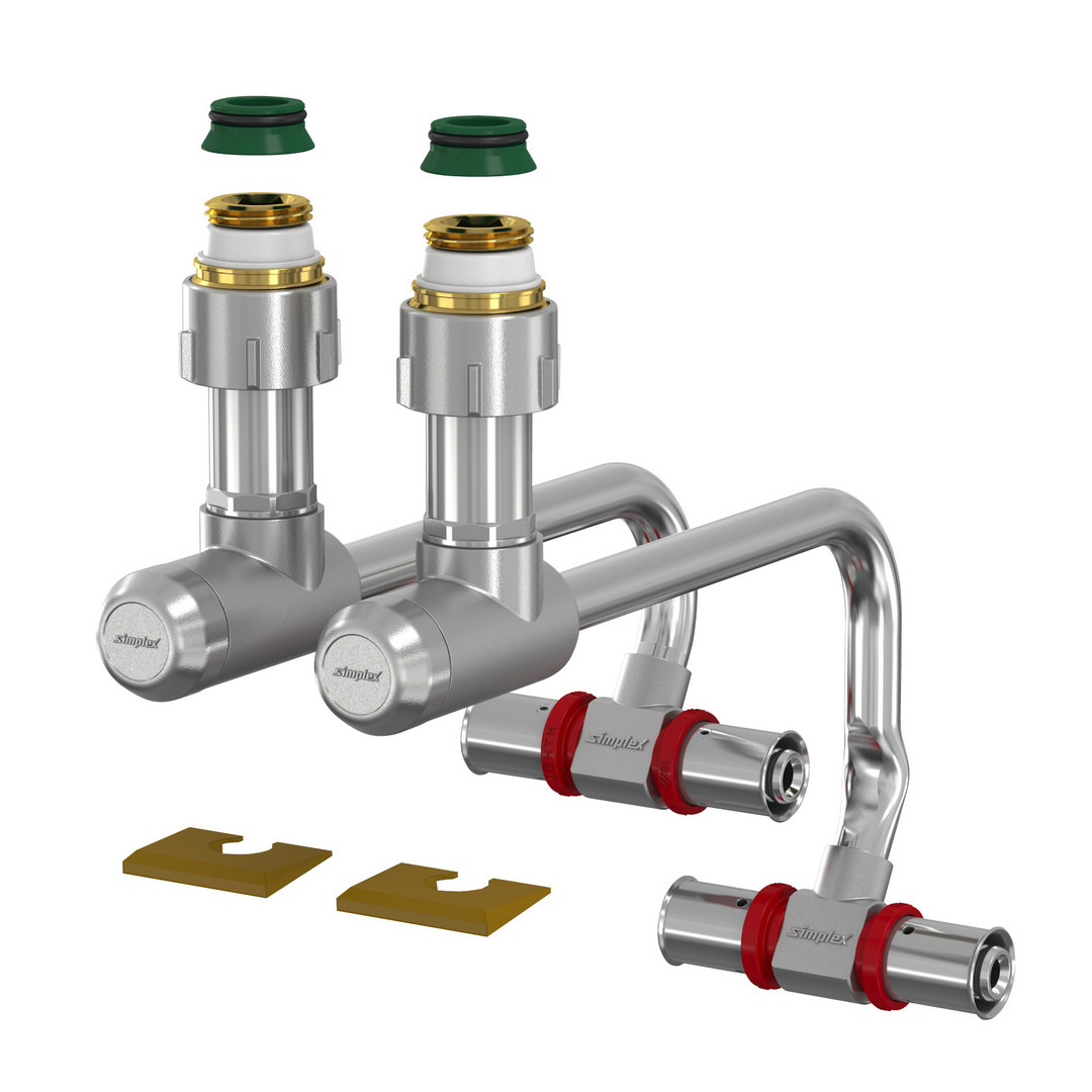 Sockelleisten-Anschlussgarnitur für den Anschluss von Ventil-Kompaktheizkörpern (Zweirohrsystem), mit Pressanschluss für Kunststoff- und Metallverbundrohr, verpressbar mit U-, TH-, F- und H-Kontur, Dichtelement aus EPDM, max. Betriebstemperatur: 110 °C Dauertemperatur/130 °C kurzzeitig, max. Betriebsdruck 10 bar, Ausstattung: 2x Teleskop-Eckverschraubungen mit Höhen- und Tiefenverstellung, 1x VL-Anschluss mit eingelötetem Kupferbogen (vernickelt) Ø 12 mm, 1x RL-Anschluss mit eingelötetem Kupferbogen (vernickelt) Ø 12 mm, 2x selbstdichtende Anschlussnippel für Heizkörper mit RP 1/2 Innengewinde, 2x Konusteile für Heizkörper mit G 3/4 M Außengewinde, je 2x Abdeckrosetten weiß, Buche und Eiche dunkel