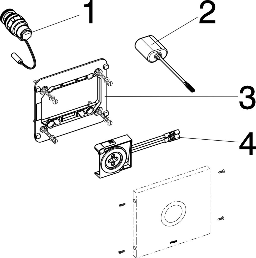 für Urinal-Spülsystem, Metall, berührungslose Infrarotspülauslösung von vorn, vandalensicher, bestehend aus Abdeckplatte, Steuerelektronik, Kartuschenventil elektronisch, Batterie, Befestigungsrahmen und Befestigungsmaterial
