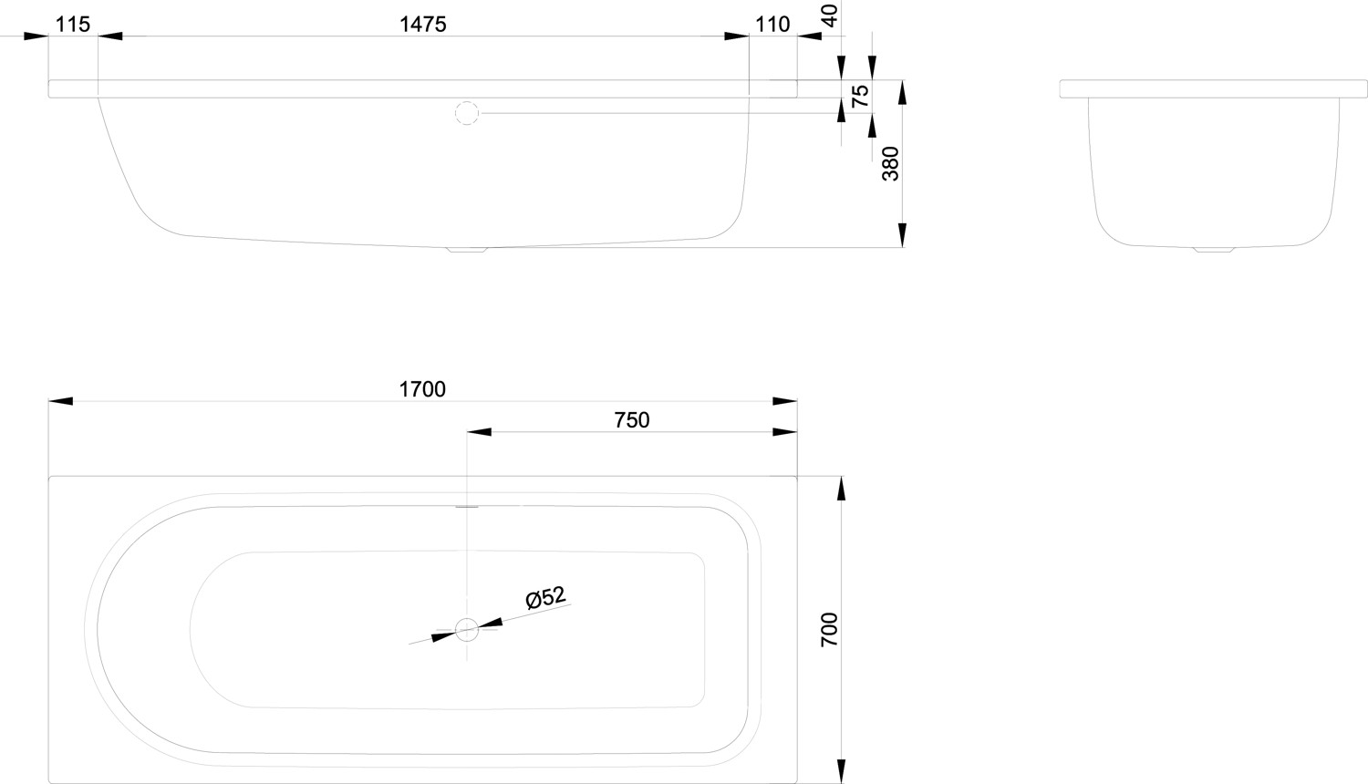 Badewanne BetteOcean Low-Line 8832 weiß, 170x70x38cm, Fußende rechts, Überlauf hinten BE8832000