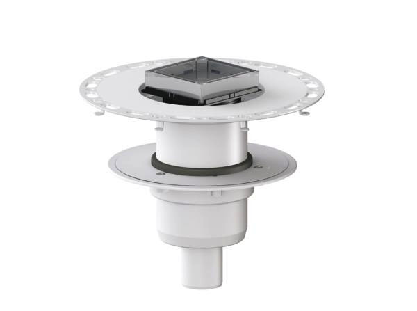 Bodenablauf mit Edelstahlaufsatz zum Befliesen mit individuellen Bodenbelägen, Vlies-kaschierter Flansch zum sicheren Anschluss an Verbund- und Bahnenabdichtungen gem. DIN 18534, Tisto-Dichtmanschette, herausnehmbarer Geruchs- und Reinigungsverschluss, Sperrwasserhöhe 50 mm (gem. DIN EN 1253), Rückstaudichtung, Distanzring, Bauschutzdeckel, Aufsatz seitenverstellbar +/- 4 mm, höhenverstellbar für Belagstärken 6-22 mm (mit Kleber), Aufsatz aus Edelstahl 1.4301, aus Polypropylen, hochschlagfest