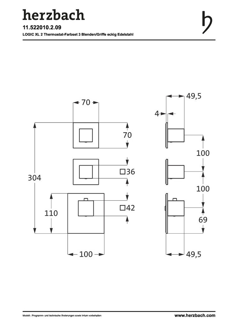 Herzbach Fertigmontageset Logic XL 2 Thermostat-Modul, 3 Blenden eckig, Griffe eckig, Edelstahl gebürstet