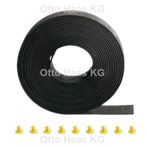 gelochtes Gummiband 7,5 m lang, 30 mm breit und 3 mm stark mit 16 stabilen Kunststoffknöpfen in gelb, für Tauch- oder Brunnenpumpen, um das Kabel am Rohr festzuhalten, im Abstand von ca. 1 Meter wird jeweils ein weiteres Lochband angebracht, im Polybeutel verpackt, Material EPDM, alterungs- und witterungsbeständig nach DIN EN 681-1