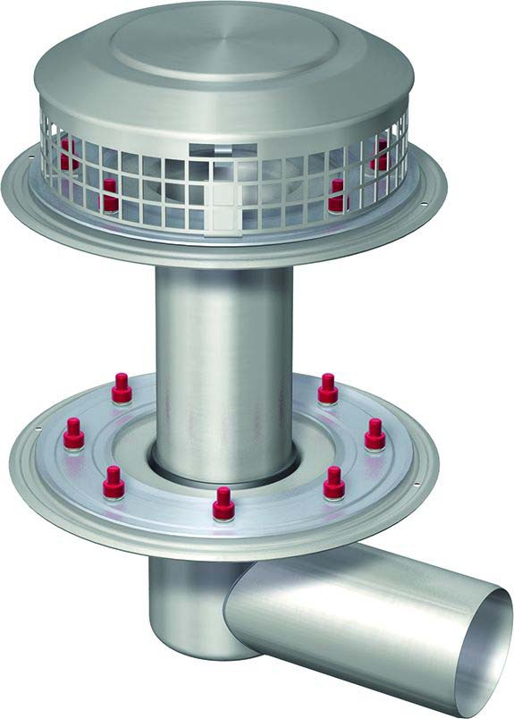 auf Dichtheit geprüft, gem. DIN EN 1253-2, Baustoffklasse A1, nicht brennbar, mit Pressdichtungsflansch für Abdichtung mit einer Abdichtungsbahn, verwendbar für 2 Dichtungsebenen, mit Dampfsperre, Stutzenneigung 1,5°