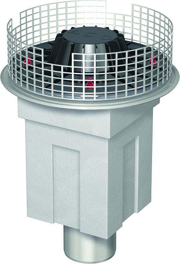 ACO Flachdachablauf Jet Styropor, DN 100, Edelstahl-Kiesfangkorb, 230 x 360 mm, 90Grad