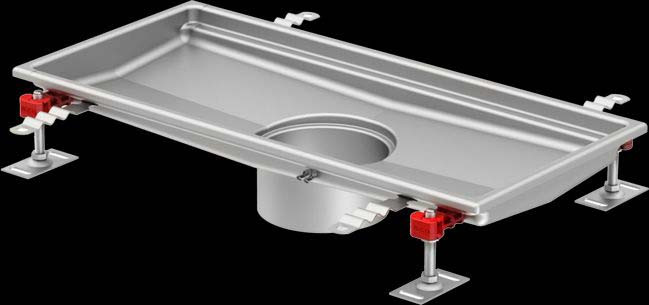 orbital geschweißter Rinnenstutzen, tiefgezogene Eimerauflage und Endstücke, werkseitige Hohlraumverfüllung, Gefälle in Längs- und Querrichtung, große Radien, Materialdicke 1,5 mm, mit Mauerankern, mit Höhenjustierfüßen, mit herausnehmbaren Schmutzfang