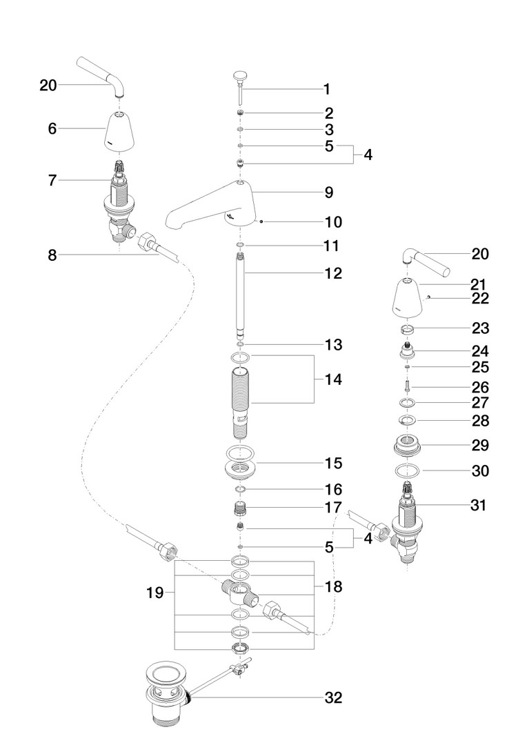 Ausladung 150 mm, starrer Auslauf, runder luftangereichter Strahl, Armaturenhöhe 85 mm, Höhe bis Luftsprudler 60 mm, Bohrungsdurchmesser Seitenventil 32 mm, Bohrungsdurchmesser Auslauf 35 mm, 2x Druckschlauch 1/2" x 1/2" x 400 mm, Durchfluss max. 5,7 l/min, bleifrei