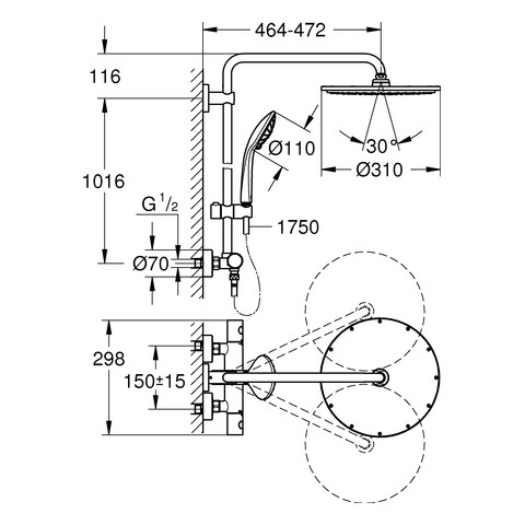 bestehend aus horizontal schwenkbaren 45 cm Brausearm, Aufputz-Thermostat mit Aquadimmer Funktion, ermöglicht den Wechsel zwischen Rainshower Cosmopolitan 310 Metall-Kopfbrause 27 477), Strahlart PureRain, mit Kugelgelenk, Drehwinkel +/-15°, Handbrause Euphoria 110 Massage (27 221), 3 Strahlarten: Rain, Massage, SmartRain, in der Höhe verstellbar mittels Gleitelement, Brauseschlauch Silverflex 175 cm (28 388), TurboStat Kompaktkartusche mit Dehnstoff-Thermoelement, SafeStop Sicherheitssperre bei 38 °C, SafeStop Plus optional einsetzbarer Temperaturendanschlag bei 43 °C, MetalGrip ergonomischer Metallgriff, DreamSpray Strahlbild, Long-Life Oberfläche, SprayDimmer stufenlose Reduktion der Durchflussmenge, innenliegende separate Wasserführung, SpeedClean Antikalk-System, TwistStop gegen Verdrehen des Brauseschlauchs, für Durchlauferhitzer ab 18 kW/h geeignet, Mindestdurchfluss 7 l/min, optionales Zubehör EasyReach Ablage (26 362)