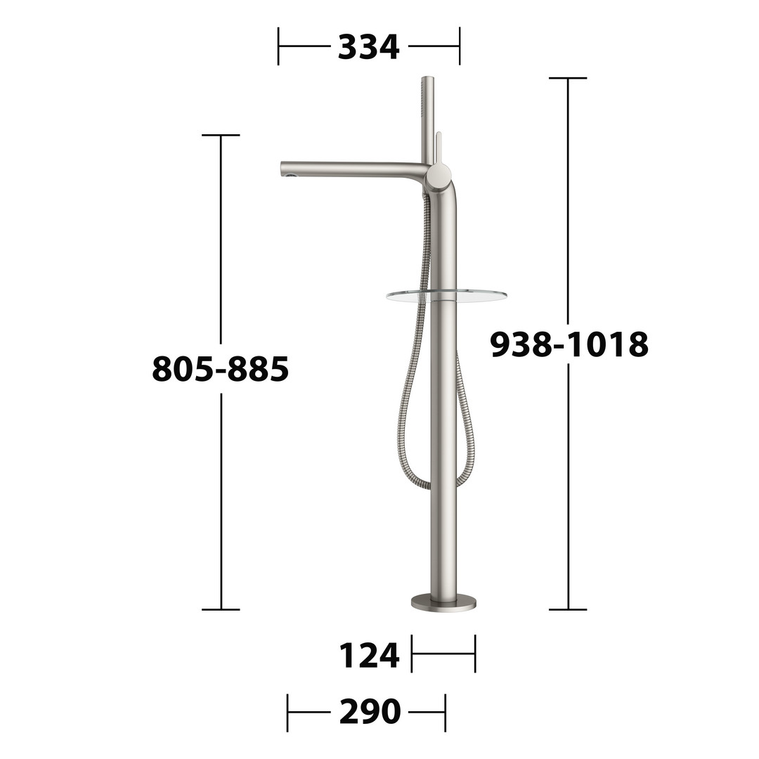 Auslaufhöhe 737-817 mm, Anschlussart Grundkörper G 1/2, Schlauchanschluss G 1/2, Brausehalter für Schläuche mit konischer Mutter, Handbrause mit 1 Strahlart (Normalstrahl), Brauseschlauch 1250 mm, Ablage schwenkbar, Mischwasserkartusche mit keramischen Dichtscheiben, mit Temperaturbegrenzung, Umstellventil mit keramischen Dichtscheiben, Strahlregler M 24 x 1, Durchflussmenge 20 l/min, Durchflussmenge Handbrause begrenzt auf 12 l/min, eigensicher gegen Rückfließen nach DIN EN 1717, für Durchlauferhitzer geeignet