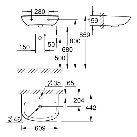 GROHE Waschtisch Bau Keramik 60,9 x 44,2 cm, 1 Hahnloch, mit Überlauf, wandhängend, alpinweiß FG39421000