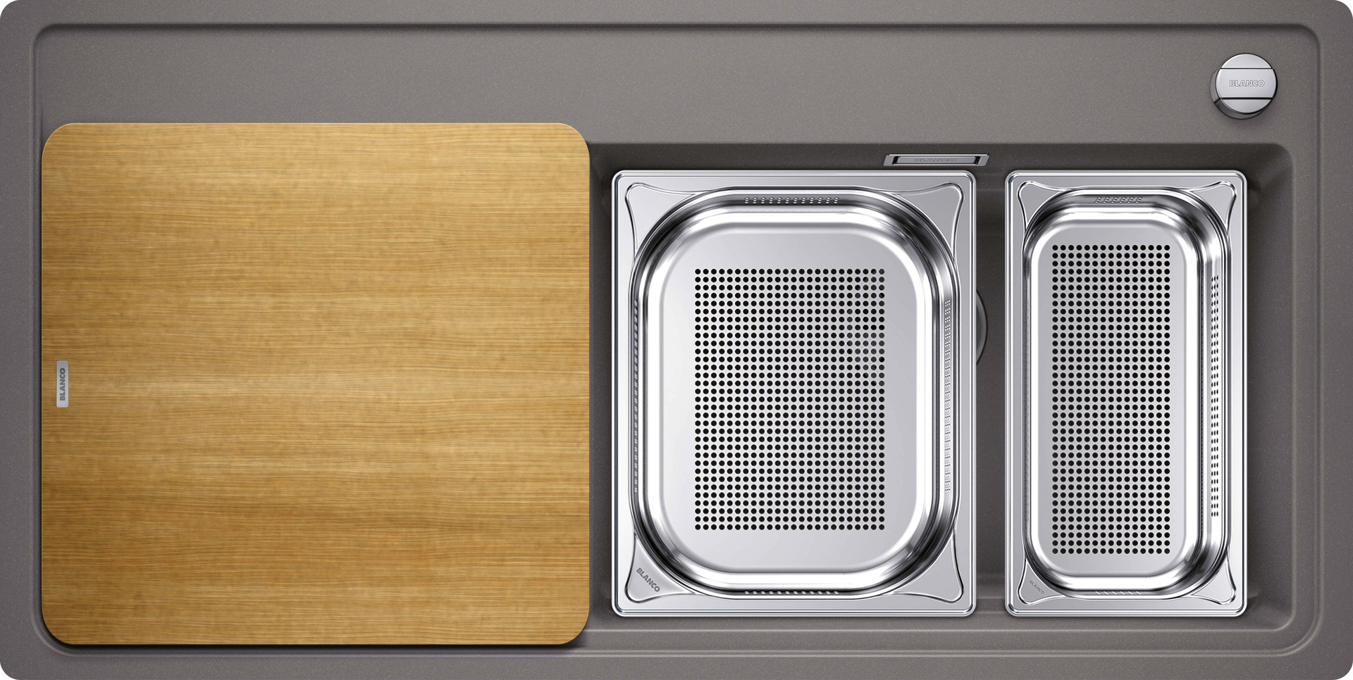 Becken-Tiefe 19 cm, Esche-Compound-Schneidbrett, gelochter GN 1/3 Garbehälter, gelochter GN 1/2 Garbehälter, Ablaufgarnitur mit Raumsparrohr, 3 1/2" Korbventil, Ablauffernbedienung (Drehbetätigung), flachbündige Ausführung