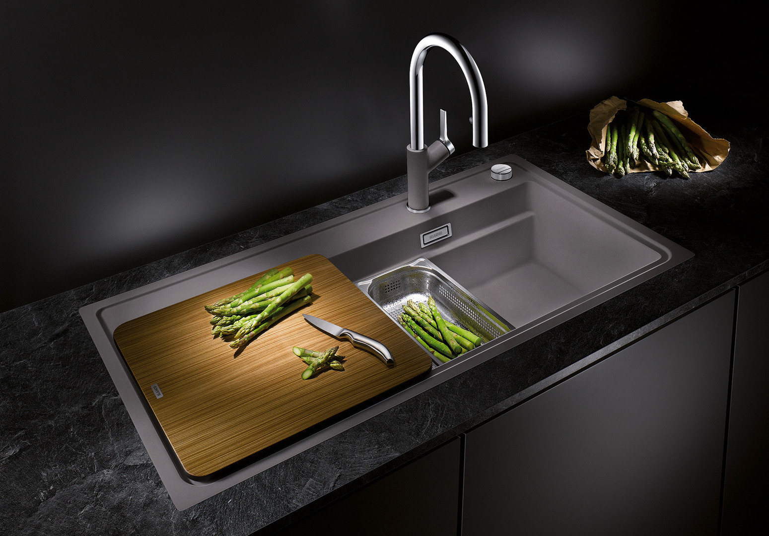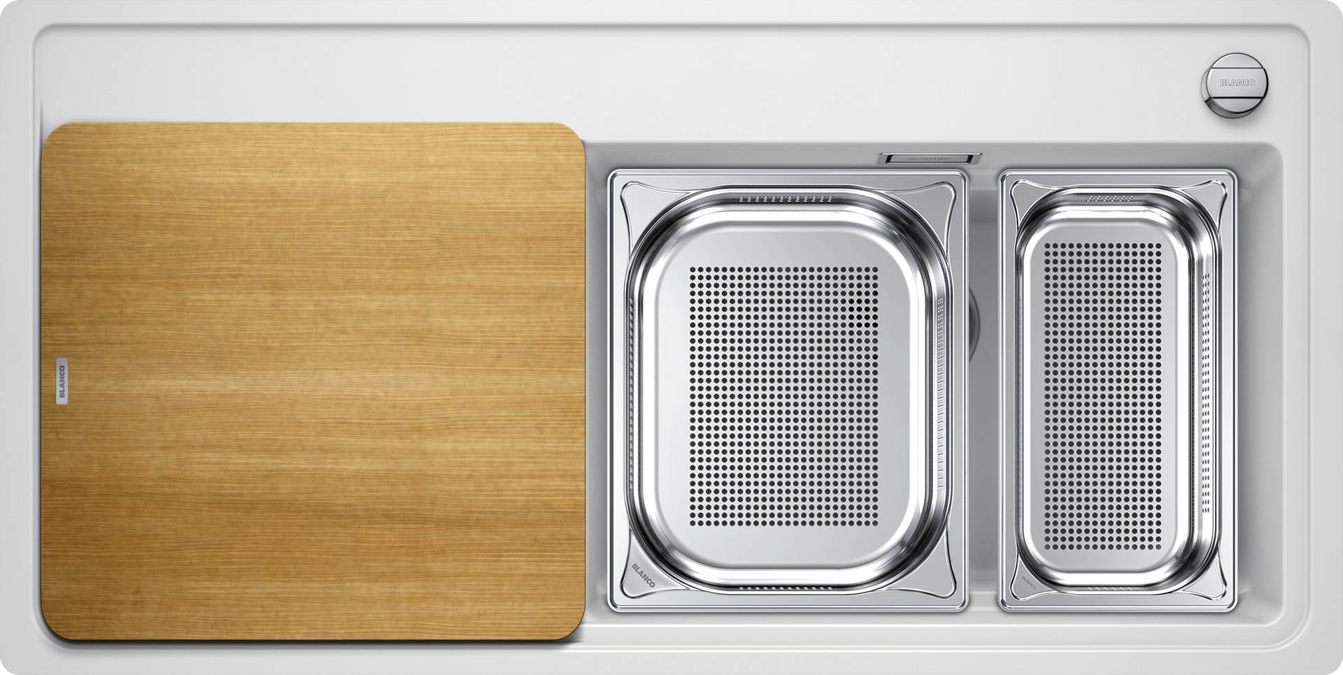 Becken-Tiefe 19 cm, Esche-Compound-Schneidbrett, gelochter GN 1/3 Garbehälter, gelochter GN 1/2 Garbehälter, Ablaufgarnitur mit Raumsparrohr, 3 1/2" Korbventil, Ablauffernbedienung (Drehbetätigung), flachbündige Ausführung
