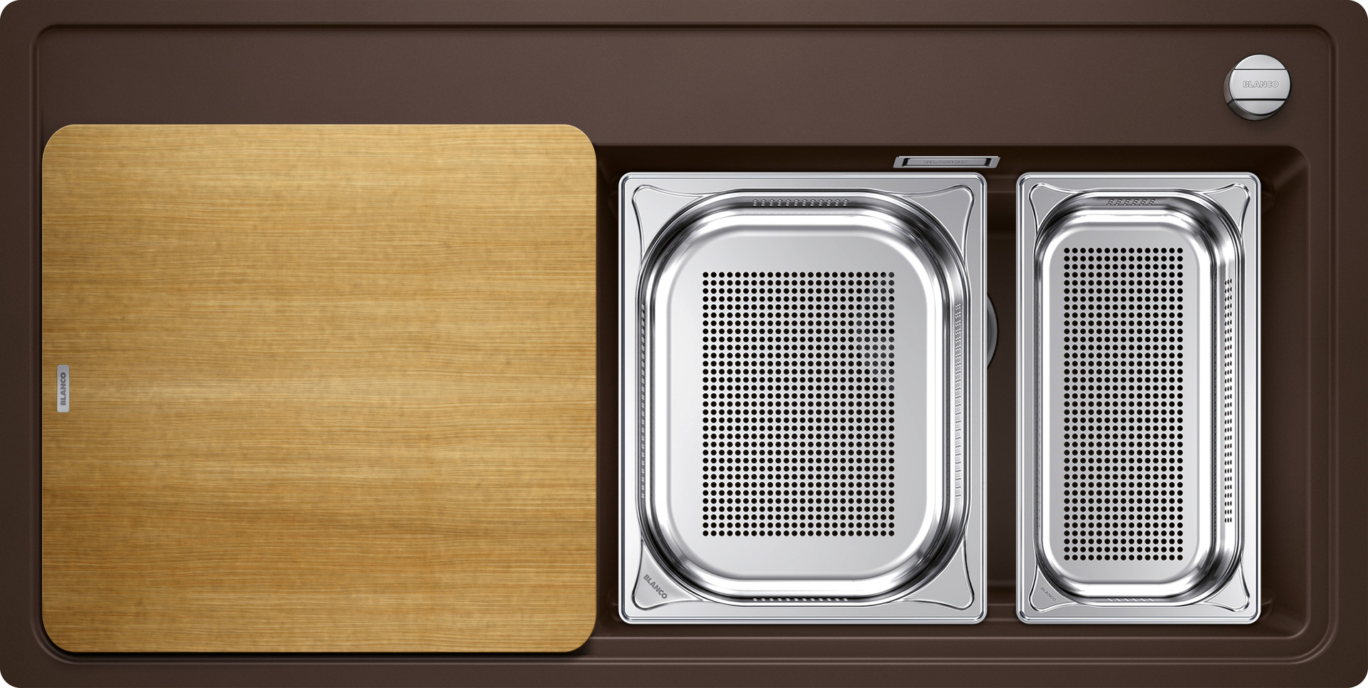 Becken-Tiefe 19 cm, Esche-Compound-Schneidbrett, gelochter GN 1/3 Garbehälter, gelochter GN 1/2 Garbehälter, Ablaufgarnitur mit Raumsparrohr, 3 1/2" Korbventil, Ablauffernbedienung (Drehbetätigung), flachbündige Ausführung
