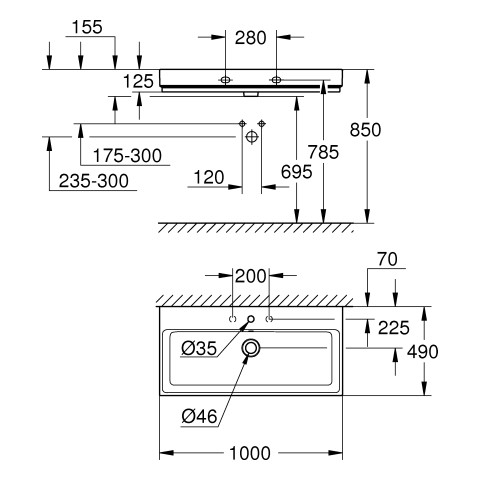 GROHE Waschtisch Cube Keramik 100 x 49 cm, 1 Hahnloch, 2 weitere vorgestochen, mit Überlauf, alpinweiß