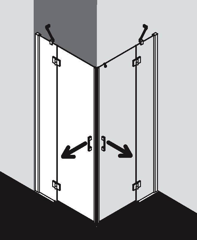 kompletter Eckeinstieg besteht aus LI ESR Eckeinstieg Halbteil rechts und LI ESL Eckeinstieg Halbteil links, Halbteile unterschiedlicher Breite beliebig kombinierbar, teilgerahmter Eckeinstieg mit zwei Glasflügeln, nach außen öffnend, mit zwei Festfeldern, mit zwei Stabilisierungen (innen), Verglasung mit 5 mm Einscheiben-Sicherheitsglas nach DIN EN 12150, Profile aus eloxiertem Aluminium, Griffe und Gelenke aus Metall, Verstellmöglichkeit im Wandprofil 25 mm, Beschlagsgelenk mit Hebe-Senk-Mechanismus, durchgehende Magnetleisten und Dichtprofile, waagerechte Dichtleiste mit Wasserabpralleffekt, mit Bodenschwelle (Höhe 6 mm) oder ohne Bodenschwelle (bodenfrei) installierbar, Befestigungsmaterial, transparenter Handtuchhalter-Haken