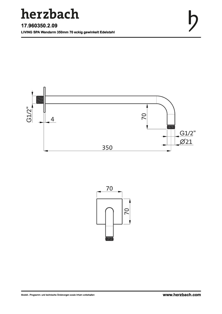 Herzbach Wandarm Living Spa iX square 350 mm, für Regenbrause, Rosette 70x70mm, Edelstahl gebürstet HF17960350209