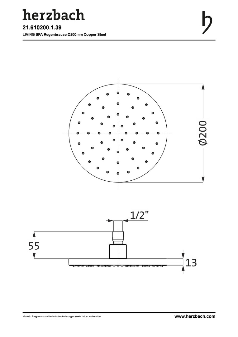 Herzbach Regenbrause Living Spa round d= 200mm, für Decken-/ Wandarm, copper steel HF21610200139