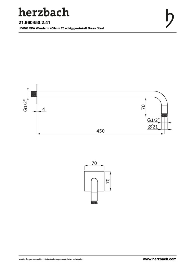Herzbach Wandarm Living Spa seven square für Regenbrause, 1/2", 450mm, brass steel HF21960450241
