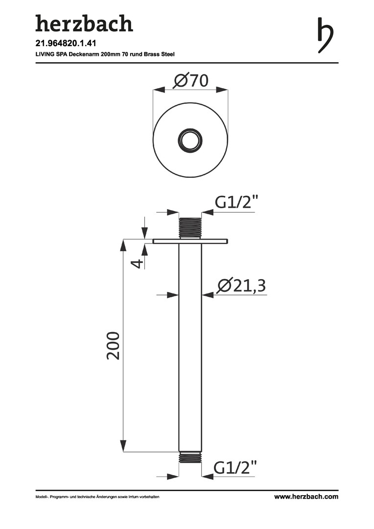 Herzbach Deckenarm Living Spa seven round für Regenbrause, 1/2", 200mm, brass steel