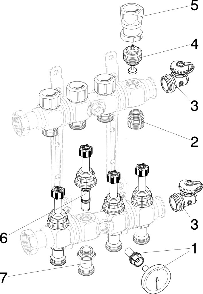 Anschluss links- und rechtsseitig, Durchflussmengenmesser 0-5 l/min, 1 KFE-Hahn je Heizkreisverteilerbalken, Schutzkappe, Wandhalterungen verzinkt/schallgedämmt, für Fonterra-Flächentemperierung, geeignet für Stellantrieb Modell1249, 1249.1, Fonterra Smart Control-Stellantrieb Modell1250.15, Eurokonus mit Überwurfmutter G1