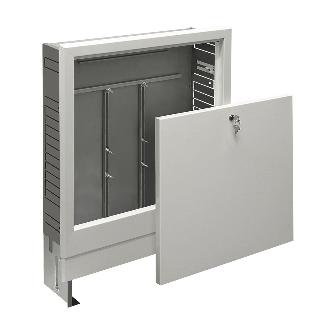 für Simplex Verteiler, Schrankhöhe verstellbar von 750 bis 850 mm, Schranktiefe 110-165 mm, mit einer Randaufbiegung im Winkel 45°, mit Verteilermontageschiene, Pulverbeschichtung, aus verzinktem Stahlblech in geschlossener Ausführung, Frontklappe mit Schlüsselschloss, Vor- und Rücklaufanschlüsse wahlweise von links, rechts oder unten, Clipschiene für Reglermodulleiste, Rohrumlenkschiene, im Karton verpackt, abnehmbare Frontschürze