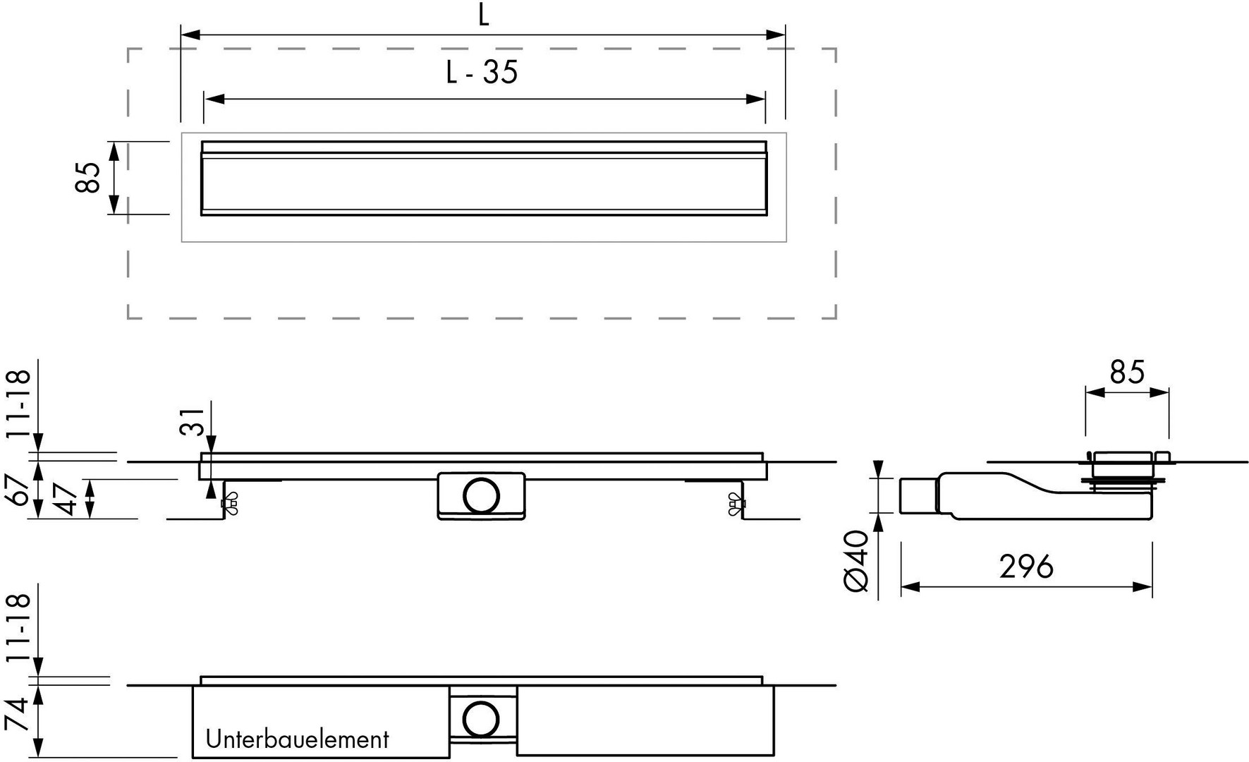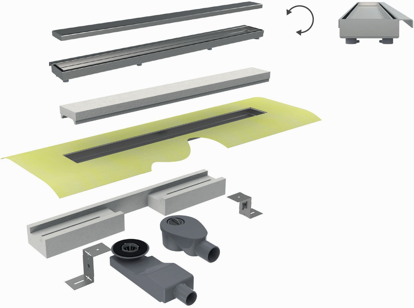 Rinnenkörper mit werkseitig angebrachten Dichtvlies, doppelseitig am Flansch verklebt, 2 aufsteckbare Siphons (28 und 50 mm Sperrwasserhöhe – leicht reinigbar), höhenverstellbarer Fliesenrahmen (7 – 18 mm), Montageblock, Füße, Bauschutzkappe und drehbare Abdeckung (Edelstahl gebürstet bzw. befliesbar), normgerechter Einbau mit 50 mm Sperrwasserhöhe nach DIN 1253 (Ablaufleistung frei 40 l/min – Wand 44 l/min) Sanierungseinbau mit 28 mm Sperrwasserhöhe (Ablaufleistung frei 24 l/min – Wand 26 l/min),Bauhöhe ab 67 mm (Sperrwasserhöhe 28 mm), Bauhöhe ab 96 mm (Sperrwasserhöhe 50 mm)