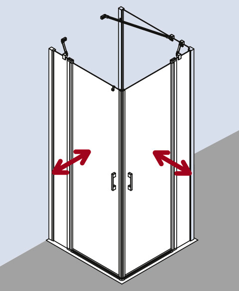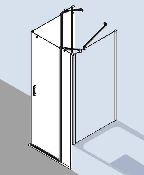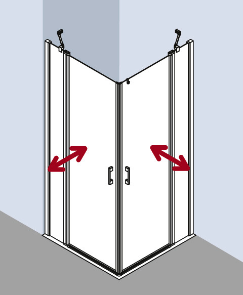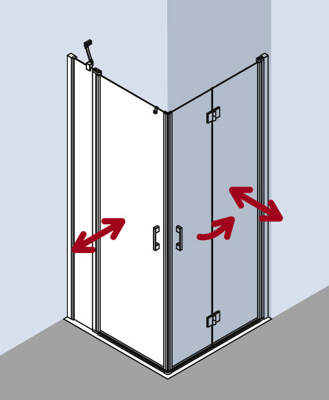 kompletter Eckeinstieg besteht aus LI EPR Eckeinstieg Halbteil rechts und LI EPL Eckeinstieg Halbteil links, teilgerahmt, Eckeinstieg mit zwei Glasflügeln-nach innen und außen öffnend, mit zwei Festfeldern, Kombination mit LI 2CR/L Eckeinstieg 2-teilig (Pendeltür mit Festfeldern) Halbteil möglich, mit zwei Stabilisierungen (innen), Glasstärke 5 mm, Profile aus Aluminium, Griffe und Gelenke aus Metall, Verstellmöglichkeit je Wandprofil 25 mm, Profilgelenk mit Hebe-Senk-Mechanismus, durchgehende Magnetleisten und Dichtprofile, waagerechte Dichtleiste in Dachrinnenform, mit 6 mm Bodenschwelle oder ohne Bodenschwelle (bodenfrei) installierbar, mit Befestigungsmaterial und transparentem Handtuchhalter-Haken, die waagerechte Schräge darf max. 5 mm betragen