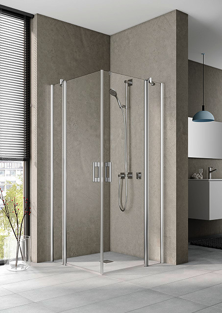 Kermi X-Like Pendeltür-Eckeinstiegshälfte 2-tlg. auf Duschwanne 78 x 200 cm, ESG klar, silber hochglanz, rechts