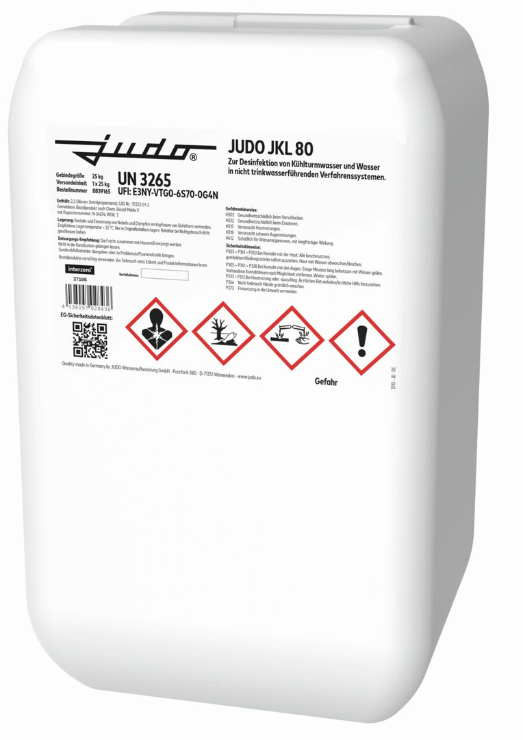 auf Basis organischer Bromverbindungen, Wirkung: Bekämpfung von Mikroorganismen, nichtoxidierendes Biozid, die Einsatzmenge ist von verschiedenen Faktoren abhängig und sollte im Einzelfall mit JUDO abgestimmt werden, normalerweise liegt die Dosierhöhe zwischen 10 und 100 g/cbm, dies entspricht einer Volumenkonzentration von ca. 8-80 ml/cbm, mit Wirksamkeitsnachweis gegen Legionellen nach DIN 13623 gemäß VDI-Richtlinie 2047