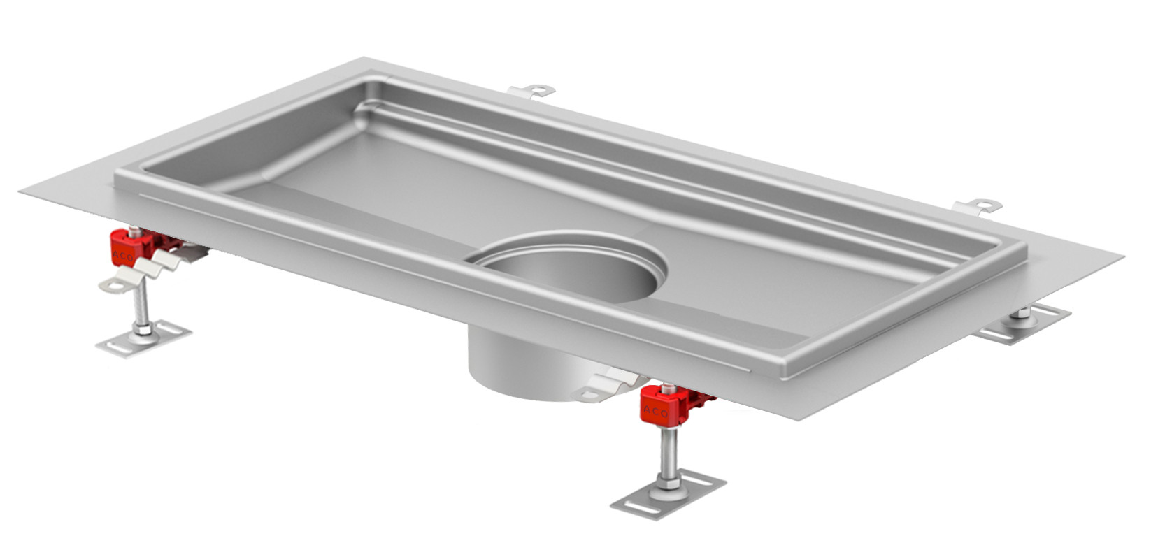orbital geschweißter Rinnenstutzen, tiefgezogene Eimerauflage und Endstücke, werkseitige Hohlraumverfüllung, Gefälle in Längs- und Querrichtung, große Radien, Materialdicke 1,5 mm, mit Mauerankern, mit Höhenjustierfüßen, mit herausnehmbaren Schmutzfang