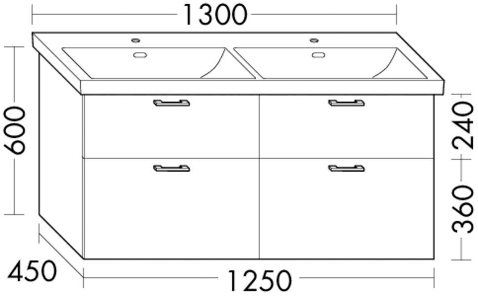Schubladen oben, mit Siphonausschnitt, Tiefe 300 mm, Auszüge unten, Tiefe 350 mm