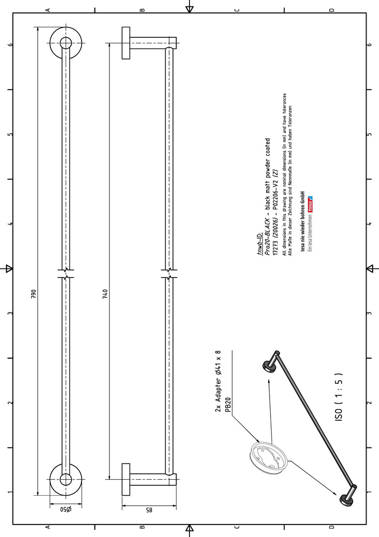 nie wieder bohren Badetuchhalter PRO 020-V2 790 x 50 x 85 mm, einfach, Zinkdruckguss, Edelstahl, hochglanzverchromt