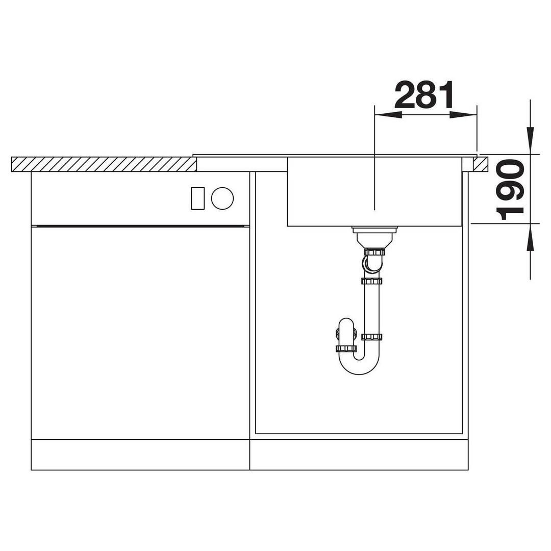 Beckentiefe 19 cm, großes Becken mit kleiner Abtropffläche, Funktionsebene mit fließendem Übergang zur Abtropffläche, Überlauf C-overflow und Ablaufsystem InFino, Ablaufgarnitur mit Raumsparrohr, 3 1/2" InFino-Korbventil mit Ablauffernbedienung (Drehbetätigung), Einbau von oben, Untermaß 60 cm