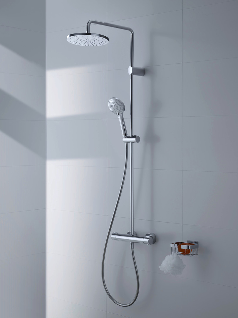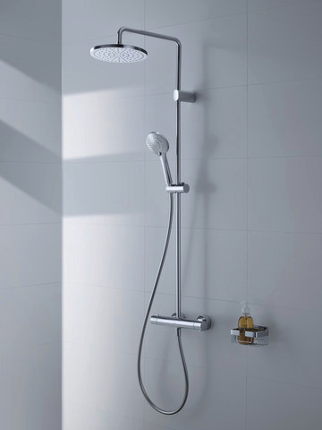 Thermostatkartusche, Sicherheitssperre (38 °C), Kopfbrause 1 Strahlart, Handbrause 3 Strahlarten, Durchmesser Kopfbrause 250 mm, Wasseranschluss 1/2", Stichmaß 150 mm +/-15 mm, Schlauchanschluss 1/2", Kopfbrause im Winkel verstellbar, Handbrausenhalterung höhenverstellbar, mit Rückflussverhinderer, Höhe 1124 mm