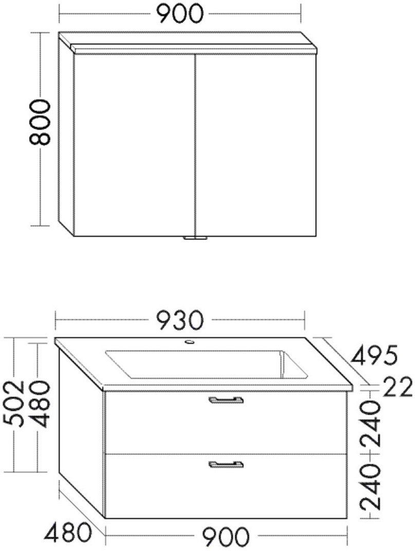 Spiegelschrank, Spiegeltüren beidseitig verspiegelt, LED-Aufsatzleuchte, 8,4 W, Glaseinlegeböden, Schalter-/Steckdosenelement unten, Keramik-Waschtisch, Muldentiefe: 120 mm, Beckenmaß 680 x 290 mm, Waschtischunterschrank, 1 Schublade oben mit Siphonausschnitt, 1 Auszug unten, mit Raumsparsiphon