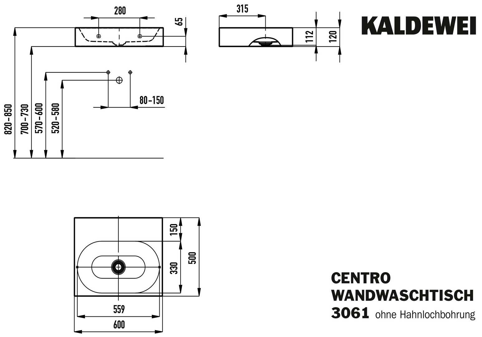 Kaldewei Wand-Waschtisch CENTRO 3061 60x50cm, ohne Hahnloch, chrom, Perl-Effekt, schwarz