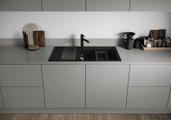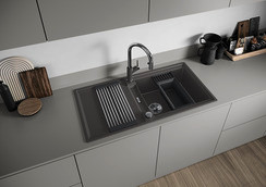 Beckentiefe 20 cm, XL-Becken in Kombination mit Ablauf und ebener Abtropffläche, mit multifunktionale ADIRA-Klappmatte (kann als Aufsatz auf dem Becken oder als Abtropffläche verwendet werden), Ablaufgarnitur mit Raumsparrohr, 3 1/2“ InFino-Korbventil mit integrierter Ablauffernbedienung (Drehknopf) für das Hauptbecken, reversibel einbaubar, Einbau von oben, Untermaß 60 cm