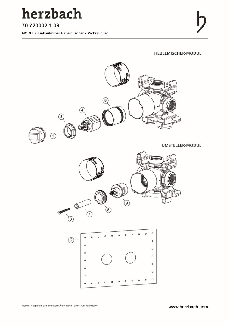 Herzbach Hebelmischer-Einbaukörper MODUL7 Einbautiefe 6cm - 9cm, für 2 Verbraucher, 2 Wege-Umsteller HF70720002109