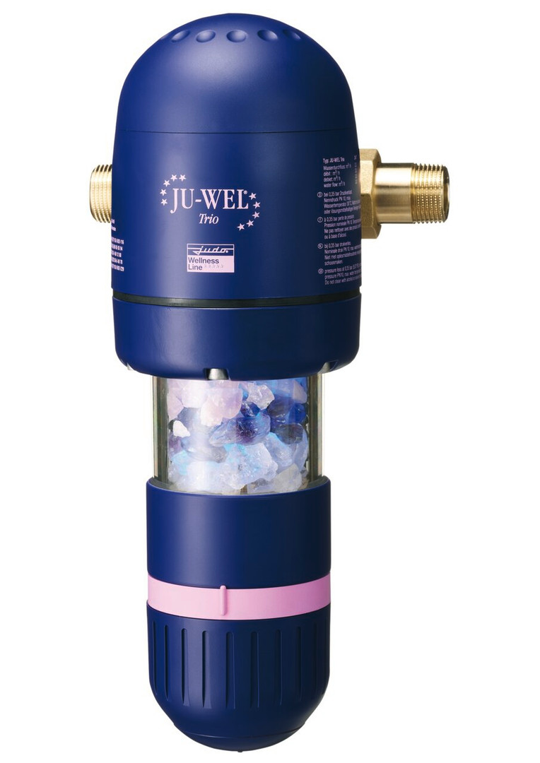 waagerechter oder senkrechter Einbau möglich, für Trinkwasser bis 30 °C, Betriebsdruck 1,5-10 bar, Gehäuse aus Kunststoff (PN 10), mit Sichtfenster und Lichtschutz, Füllung aus energetisierten Amethyst-, Rosenquarz- und Bergkristall-Edelsteinen zur Juwelierung des Trinkwassers, eingebauter Lichtlader zur Revitalisierung der Edelsteine, Gewindeanschluss nach DIN EN 10226-1, Einbau-Drehflansch mit Bajonettanschluss aus Messing mit Verschraubungen