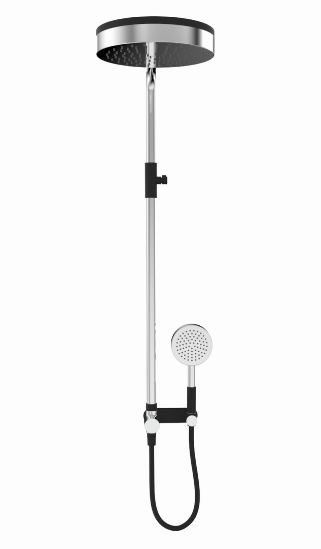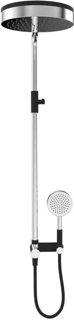 Wandstange Messing hochglanzverchromt, starr, Gesamthöhe 1046 mm, Abstand Bohrlöcher 795 mm, Ausladung Kopfbrause 507 mm, Stangendurchmesser 25 mm, mit integriertem Wandanschlussbogen, Umsteller und Brausehalter, Wandhalter und Blende schwarz, Handbrause aus Messing hochglanzverchromt, Kunststoffgriff schwarz, Ø 250 mm, 1 Strahlart, schwarzer Kunststoffbrauseschlauch 1500 mm, Kopfbrause Messing hochglanzverchromt und Kunststoff schwarz, mit Befestigungsmaterial