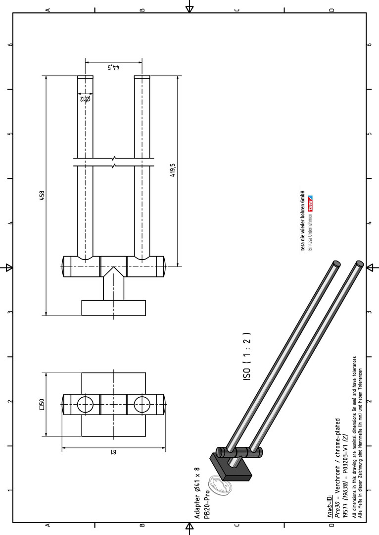 nie wieder bohren Handtuchhalter PRO 030-V1 50 x 81 x 458 mm, zweiarmig, Zinkdruckguss, Edelstahl, hochglanzverchromt