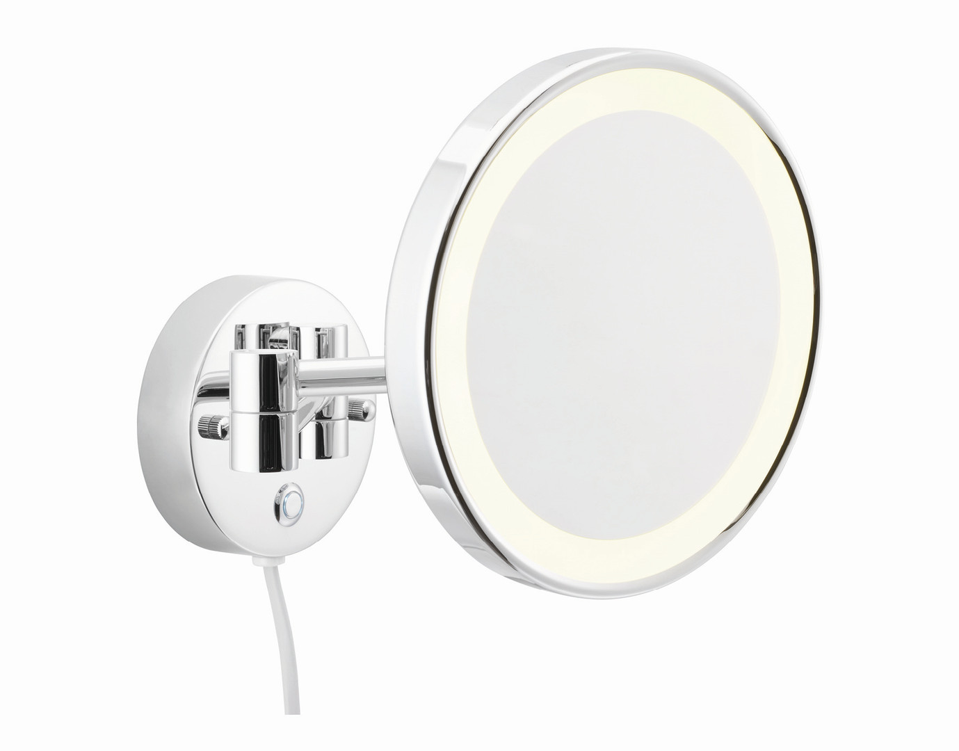 Ø Spiegel 160 mm, Ausladung max. 365 mm, 5-fache Vergrößerung, Doppelgelenkarm, 3000-5500 K, Wechsel zwischen Kalt- und Warmlicht, IP 44, Direktwandanschluss möglich (zur Selbstmontage), mit Befestigungstechnik